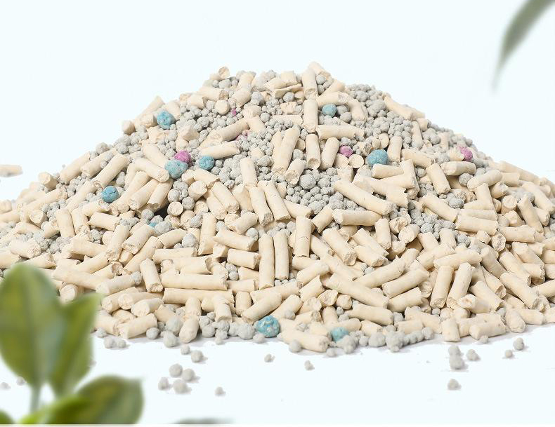 為了讓貓砂環保可降解,第三代貓砂產品誕生了。松木、紙屑、木屑、玉米渣、各種豆渣等等,各種植物都被可以用來制作貓砂。主要原理是將這些植物做成粉末后再黏合成顆粒。最常見的豆腐貓砂就是豆渣做的。